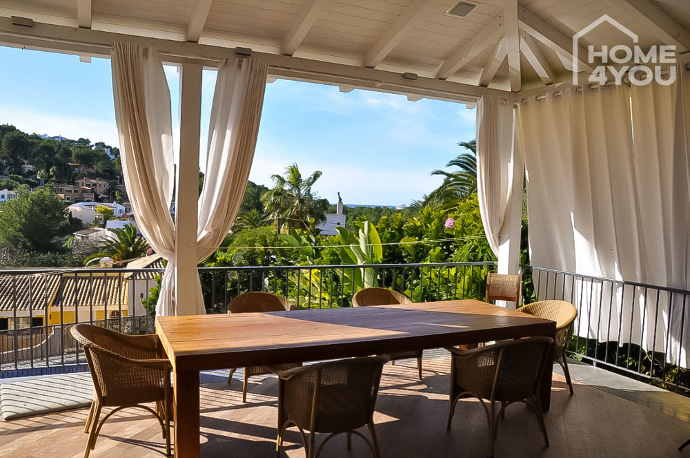 Designervilla in Calvia, 340qm, 2SZ, 2Bäder, Weinraum, Garage, Kamin, Pool, Meerblick-Sonnenterrasse