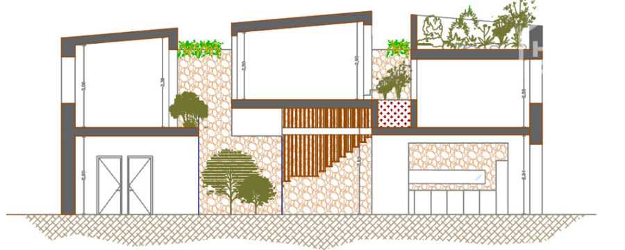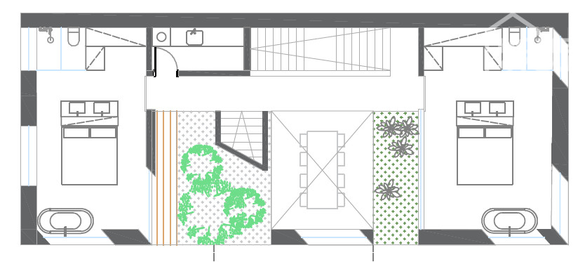 Das Zwischengeschoss ist unterteilt in eine Waschküche, 2 Schlafzimmer mit Bad en suite und Ankleideraum, eines davon mit einer kleinen Terrasse und das andere mit einem kleinen Innenhof.