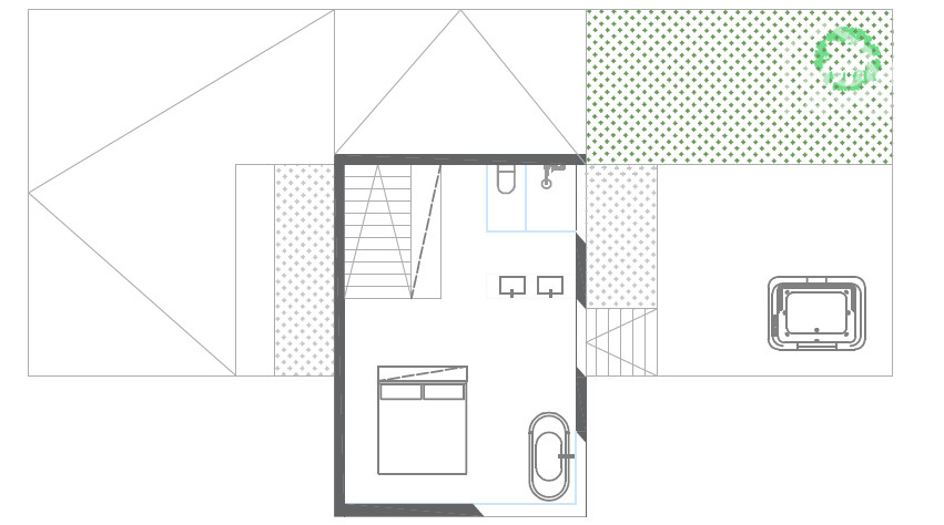 Das Obergeschoss ist eine 20 qm große Suite mit Badezimmer und Ankleideraum. Von hier aus gelangen Sie auf die 41 qm große Dachterrasse mit einem Whirlpool.