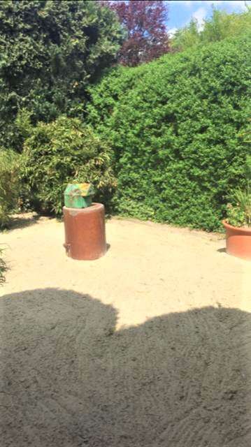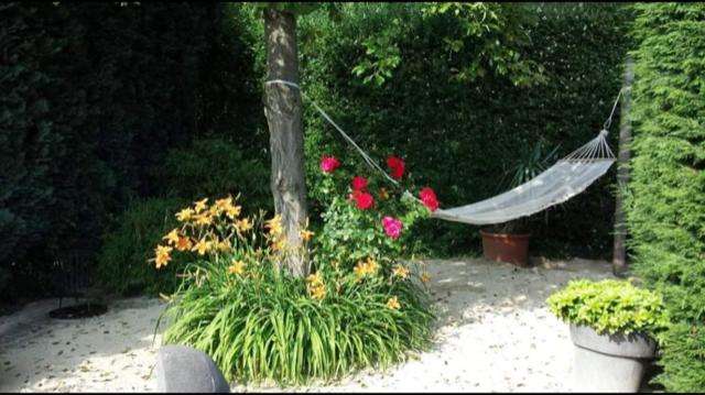 Gegenüber ist die große Garage ein Carport und eine Gartenanlage die zum relaxen einlädt