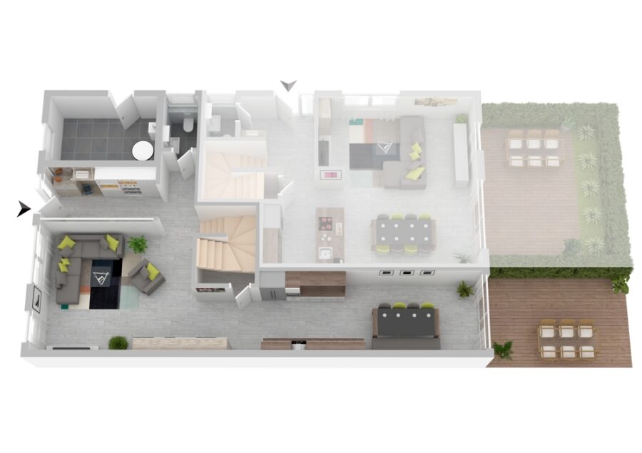Die Doppelhaushälften umfassen im Erdgeschoss einen geräumigen Wohn-/ Essbereich mit offener Küche und Zugang zur Terrasse und Garten, ein Gäste-WC mit Fenster sowie einen Dielen-/ Flurbereich.