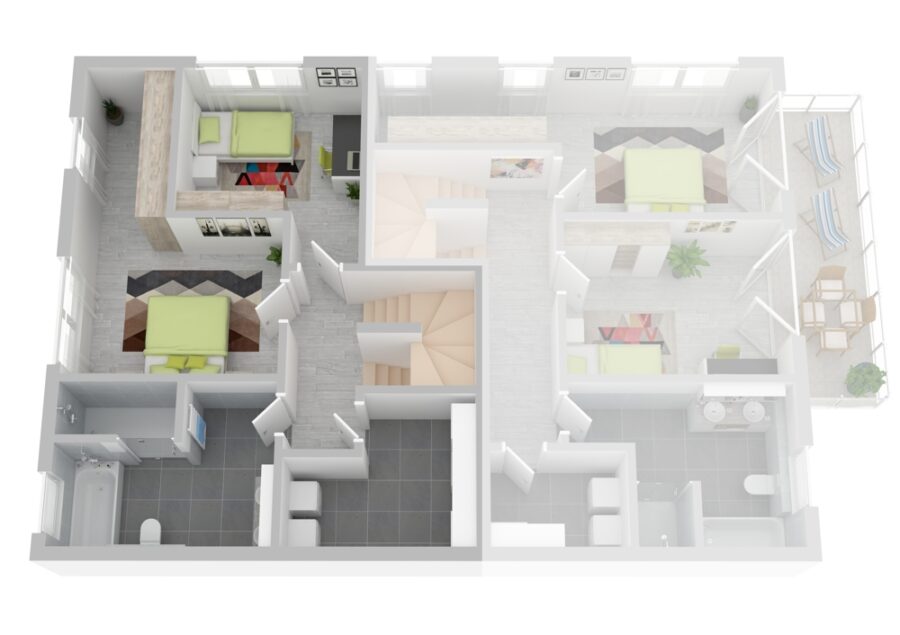 Hinweis: Die Illustrationen & Musteransichten enthalten zur besseren Verdeutlichung Ausführungsdetails, Einrichtungsgegenstände und Ansichten, die in der finalen Ausführung zum Teil abweichen können oder nicht im Angebot enthalten sind. Grundlage hierfür bildet hier die spätere Baubeschreibung und die notarielle Beurkundung.