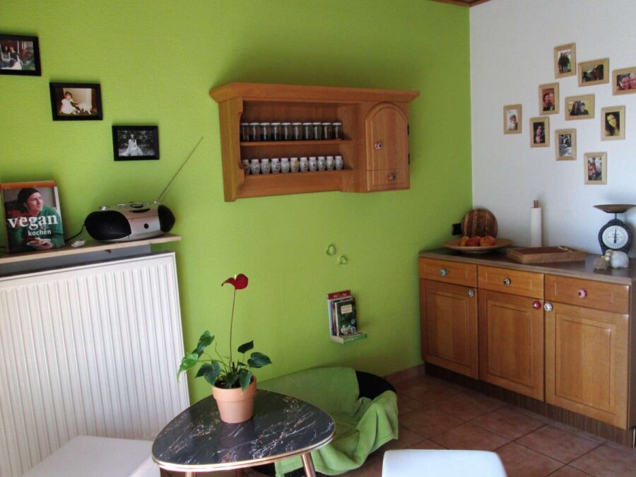 Eine Küche mit Ausgang zur Terrasse die in den Sonne-Garten führt, von hier kommen Sie auch in die Garage um einfacher zum Auto zu gelangen.