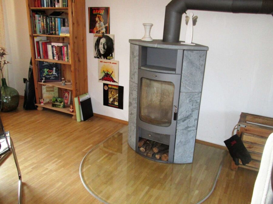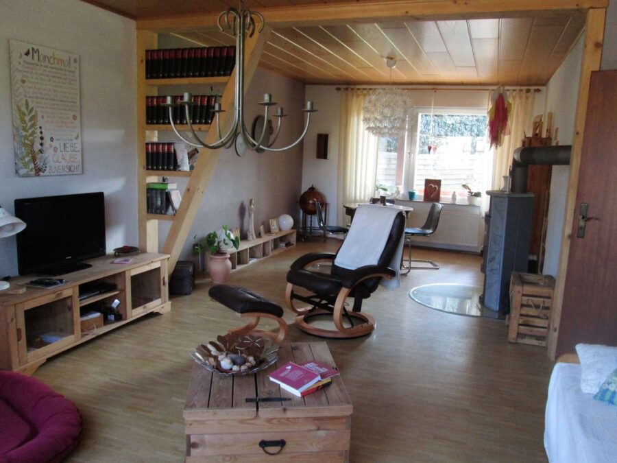 Diele, Gäste WC, offenen Wohn-Essbereich in dem ein Kaminofen seinen Platz gefunden hat.