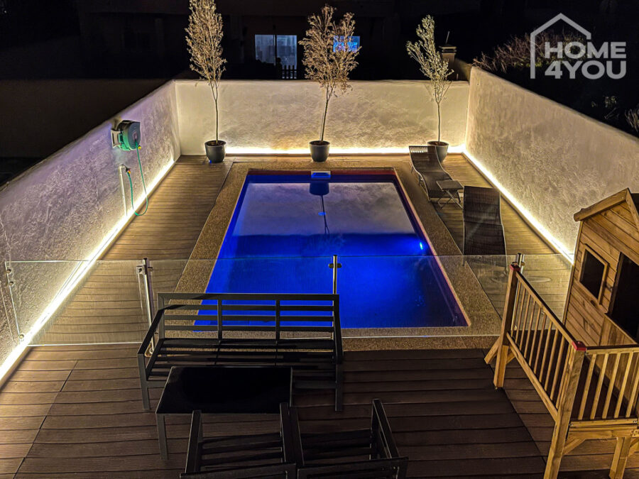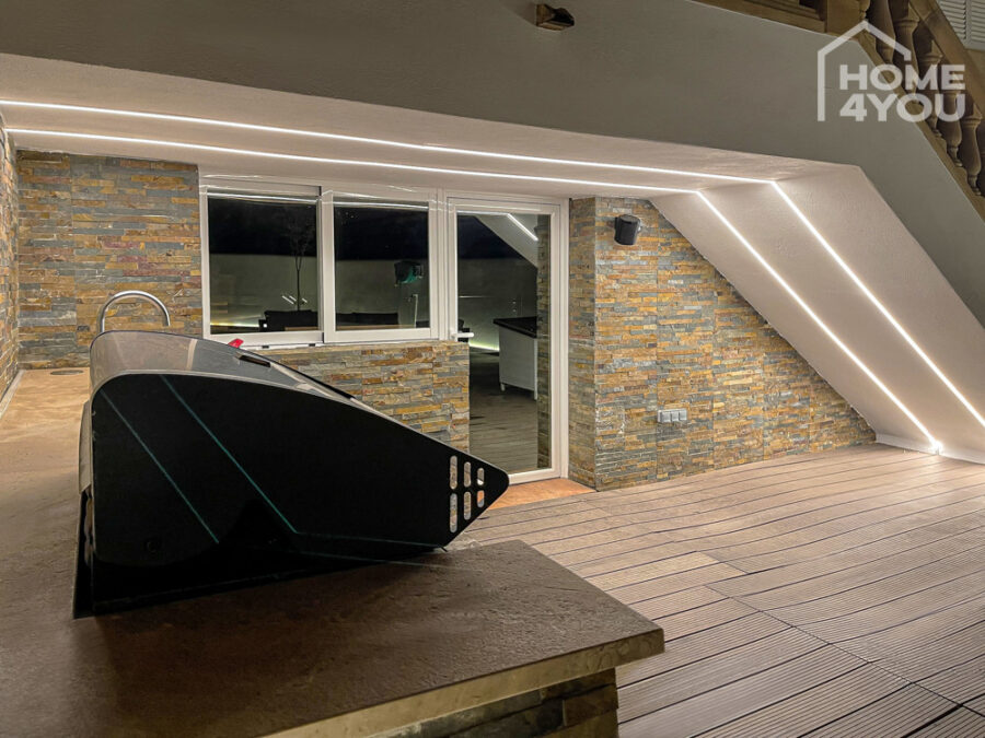 Liebevolle Details wie das umlaufende Beleuchtungssystem, das sie bequem mit Alexa steuern können und bei Nacht für ein romantisches Feeling sorgt, machen das Haus zu Ihrem ganz besonderen Wohlfühl-Ort.