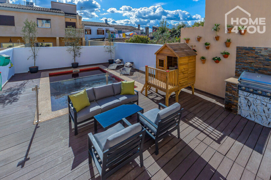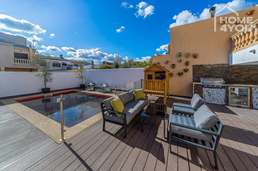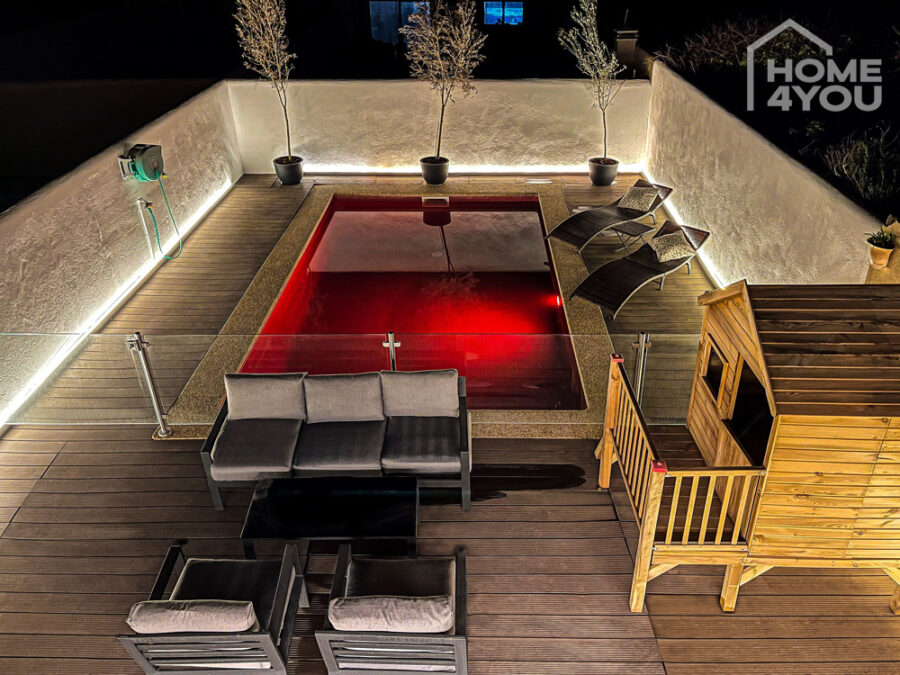 Der Außenbereich lädt sie ein, auf der einen Seite mit seiner nach Süden ausgerichteten, mit Bangkirai-Holz veredelten Terrasse, die viel Sonne verspricht, mit Chillout Area, Außenküche und Gasgrill, hier können sie mit Freunden und Familie herrliche Grillevents erleben. Auf der anderen Seite finden sie hier abgetrennt durch eine chice Glasbrüstung den eingelassenen Pool mit Liegen zum Relaxen.