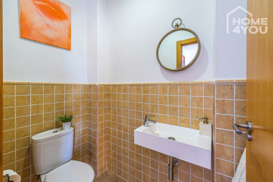 Direkt nebenan befindet sich der HWR mit Waschmaschine und Trockner, der durch eine Doppelverglaste Kunststoff-Tür getrennt ist. Ebenfalls befindet sich auf dieser Ebene noch ein Gäste-WC mit einem modernen Waschbecken und sorgt so für kurze Wege. Abgerundet wird das Gäste-WC durch die natursteinfarbenen, mediterranen Wandfliesen und die dazu passenden Bodenfliesen.