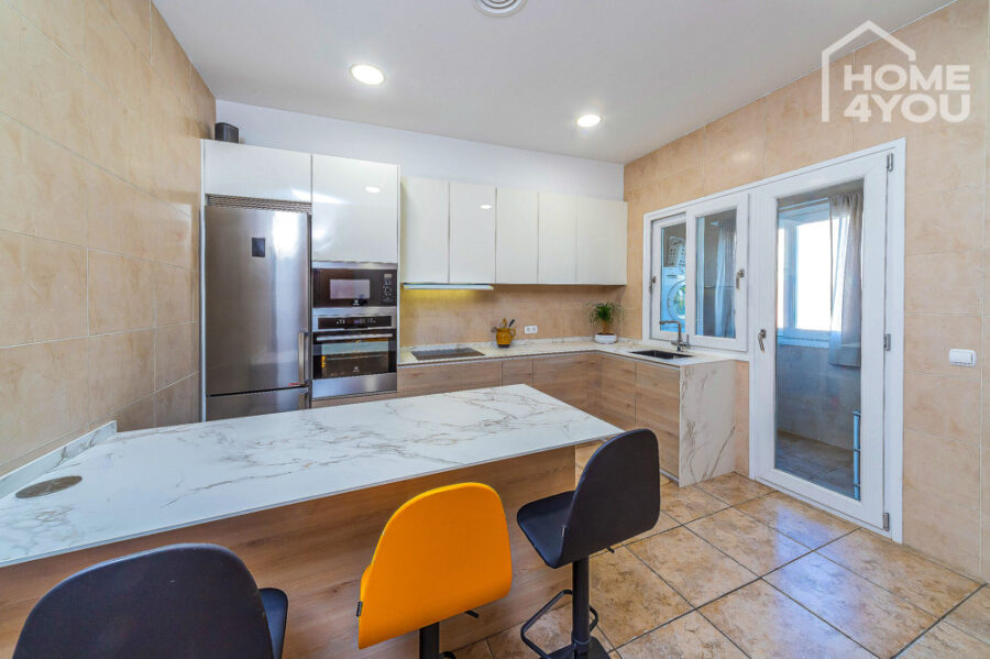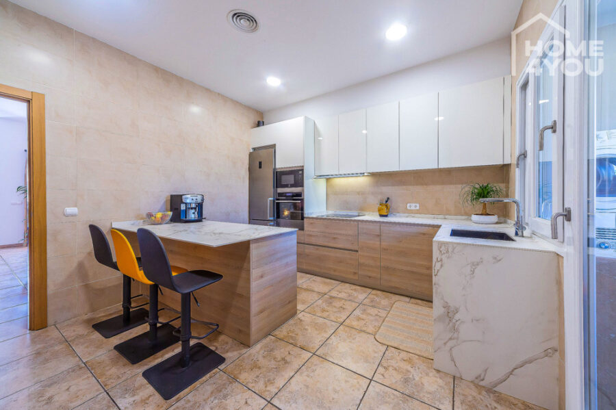 Die hochwertige Küche sorgt mit ihrer hellen Dekton-Arbeitsplatte und der modernen Hochglanzoptik für Lust auf kulinarische Hochgenüsse für die ganze Familie. Die Küche ist mit modernen Elektrogeräten wie großer Gefrier- und Kühlkombination ausgestattet und bietet ausreichend Arbeitsfläche.