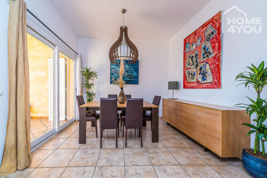 Hier befindet sich das großräumige Wohnzimmer mit Pellet Kaminofen, der für die kälteren Wintertage wohlige Wärme verspricht. Ebenso wie einen hellen Essbereich, der mit Ausgang zu einem kleinen Balkon, einen direkten Treppen-Zugang zur unteren Terrasse mit Pool bietet.