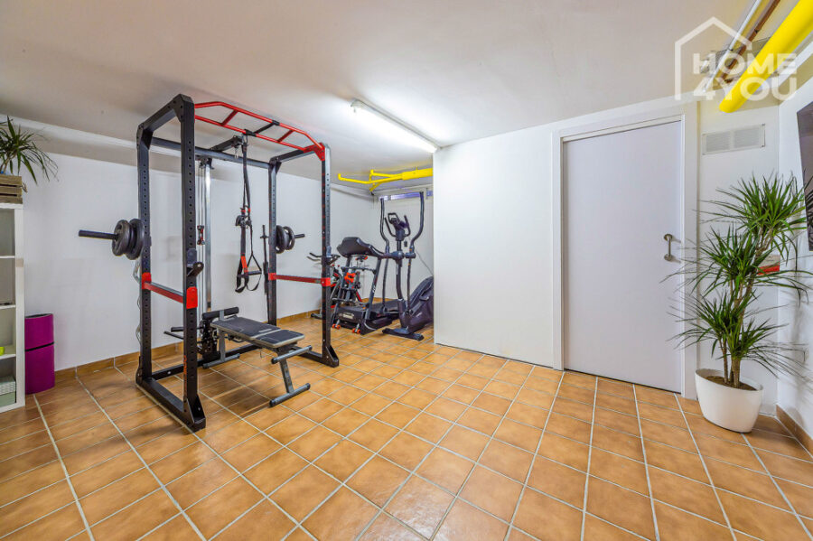 Im Untergeschoss finden sie eine großzügige Garage mit Platz für zwei Autos, viel Stauraum und einem pflegeleichten Stempelbetonboden. Von hieraus gelangen sie bequem und trockenen Fußes ins Erdgeschoss und durch einen Ausgang auch in den herrlichen Außenbereich. Für ihre Gesundheit und sportliche Betätigung gibt es auch noch einen großzügigen Fitnessraum und einen Heizungs- und Technikraum mit aerothermischem System und eine Enthärtungsanlage, die enthärtetes Wasser für das gesamte Objekt bietet, was seidenweiches Wasser und keine Kalkflecken verspricht.