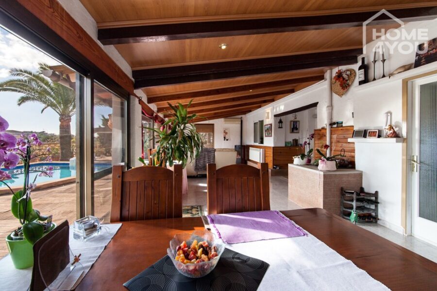 Hier betreten Sie das vollständig verglaste und helle Wohn-/ Esszimmer mit liebevollen mallorquinischen Details. Der historische Kamin wurde zum Kochen genutzt und kann weiter betrieben werden.