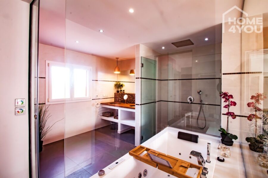 Neben dem insgesamt mehr als 40 qm großen Hauptschlafzimmer befindet sich direkt ein komfortables offenes Badezimmer mit Badewanne und Dusche.
