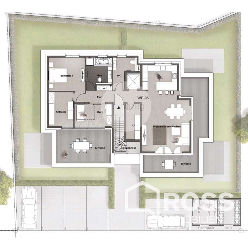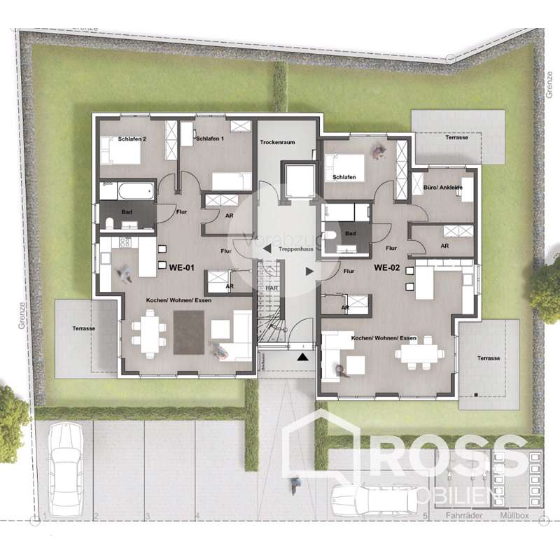 Das 560 m² große Grundstück befindet sich inmitten eines grünen Paradieses und ist zentral in Wassenberg gelegen und dennoch ruhig. Selbstverständlich verfügt jede Wohnung über einen eigenen PKW-Stellplätz direkt vor dem Haus.