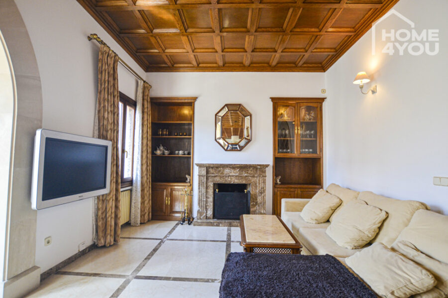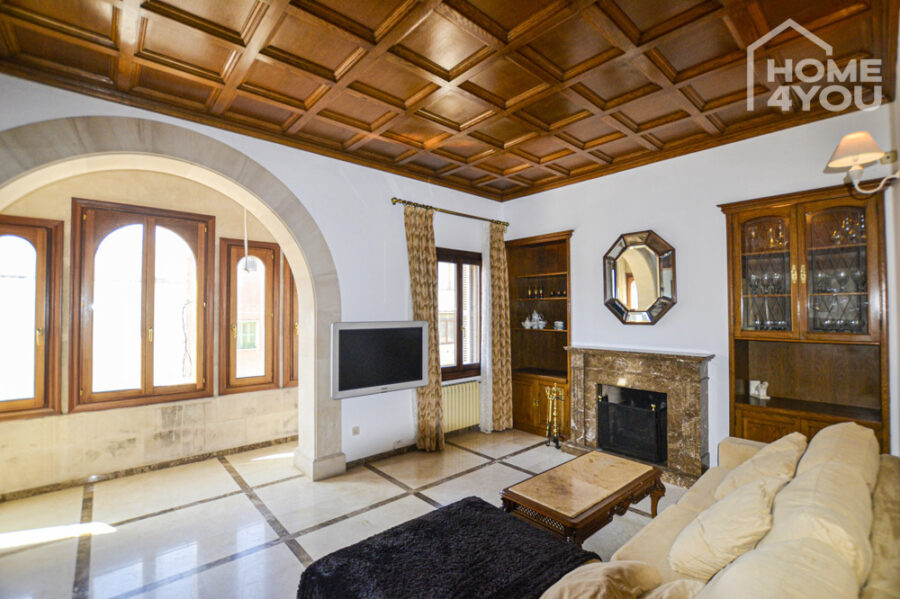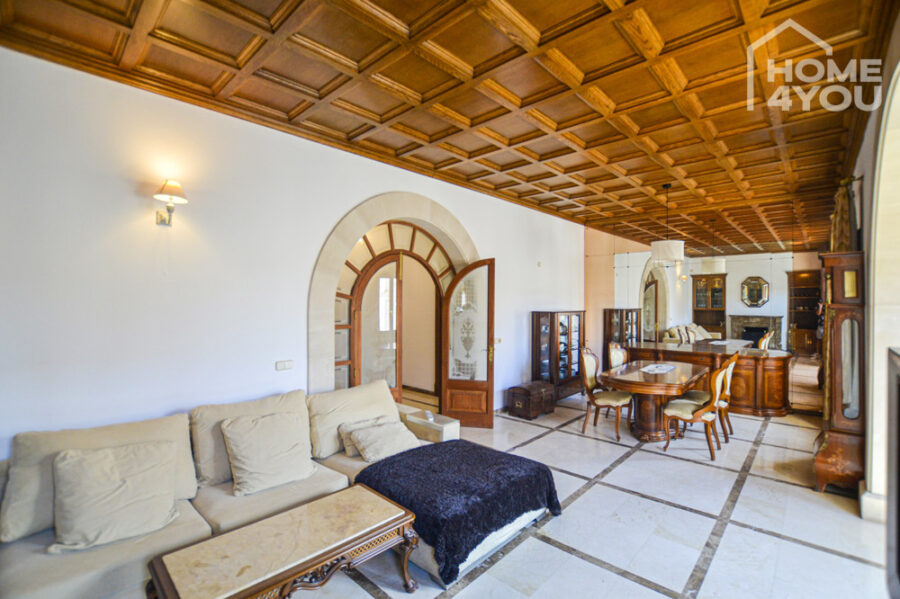 Hier befindet sich das große, helle Wohnzimmer mit beeindruckender Holzdecke und altem Marmor-Kamin.