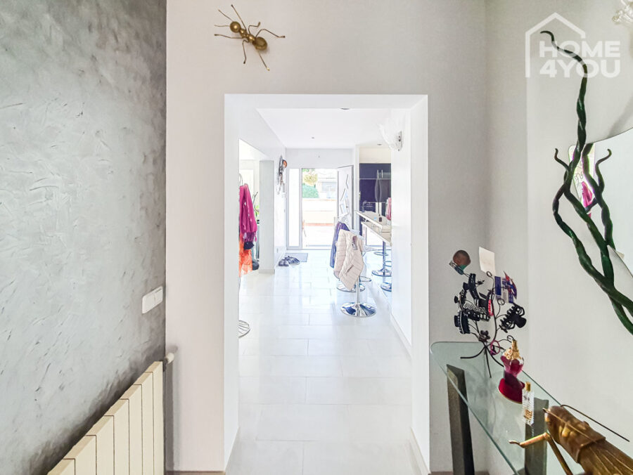 Der komplette Wohnbereich ist mit Steinzeug und vielen großen Fenstern ausgestattet, sie wirkt damit sehr hell und freundlich.
