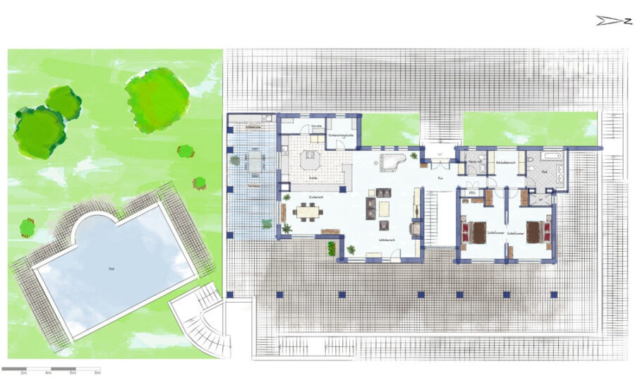 Von der Küche aus haben Sie Zugang zur Ihrer Waschküche, dem separaten Vorratsraum und zur Außenküche mit überdachtem Grill.