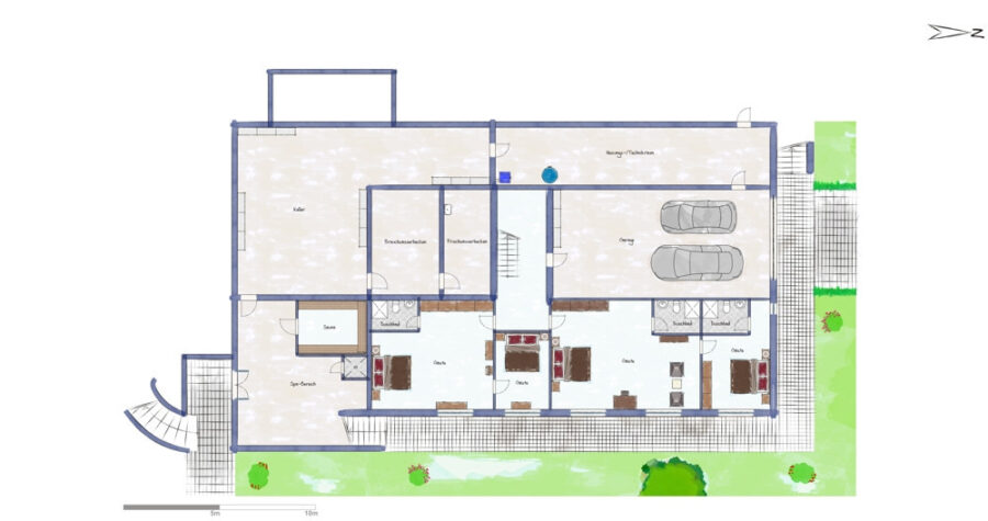 • 34 cbm Regenwassertank (z.B. für Bewässerungsanlage) und 13 cbm Trinkwassertank