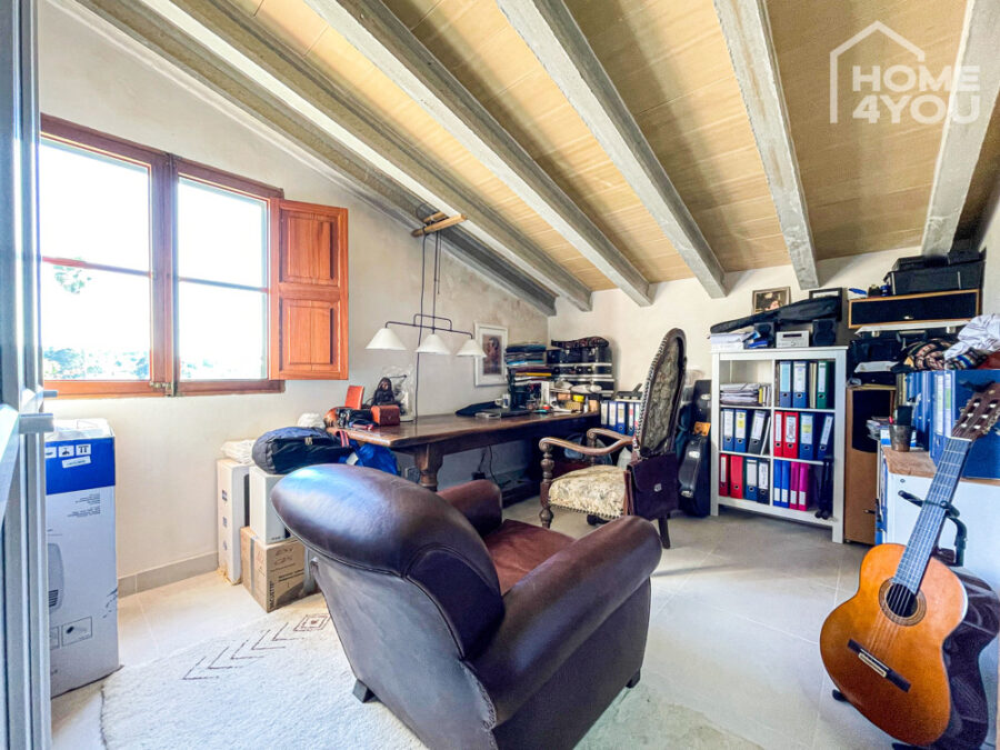 Über die Steintreppe im Flur gelangen sie in die obere Etage, hier gibt es ein großes Master-Schlafzimmer mit Bad en Suite und ein Büro, welches Sie auch leicht als weiteres Schlafzimmer oder Fitnessraum nach ihren Wünschen umgestalten können.