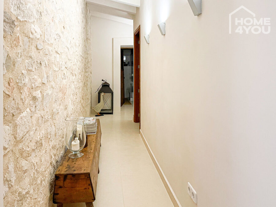 Durch den Flur mit seiner Natursteinfassade gelangen Sie in die zwei Schlafzimmer mit begehbarem Kleiderschrank und einem weiteres Duschbad.