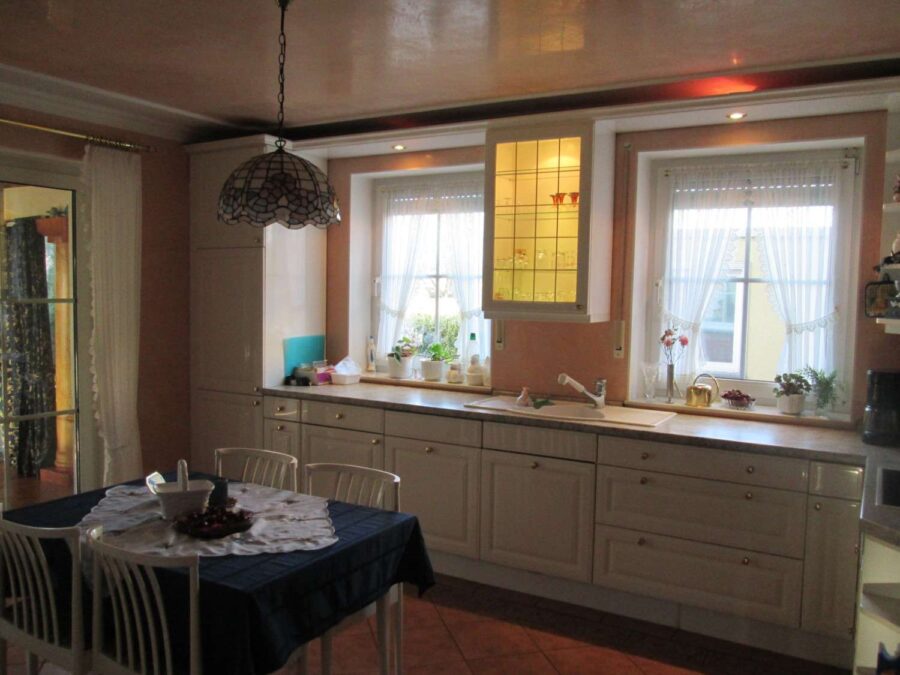 Eine große und voll eingerichtete Küche ist durch Wohnzimmer, Empfangsdiele und durch den Wintergarten zu finden.