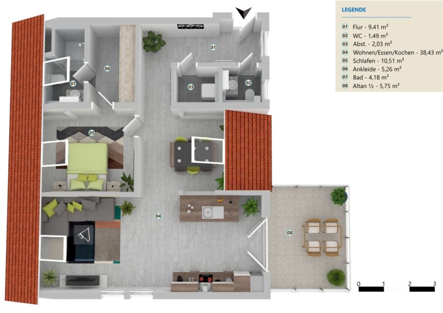 Hinweis: Die Illustrationen & Musteransichten enthalten zur besseren Verdeutlichung Ausführungsdetails, Einrichtungsgegenstände und Ansichten, die in der finalen Ausführung zum Teil abweichen können oder nicht im Angebot enthalten sind. Grundlage hierfür bildet hier die spätere Baubeschreibung und die notarielle Beurkundung.